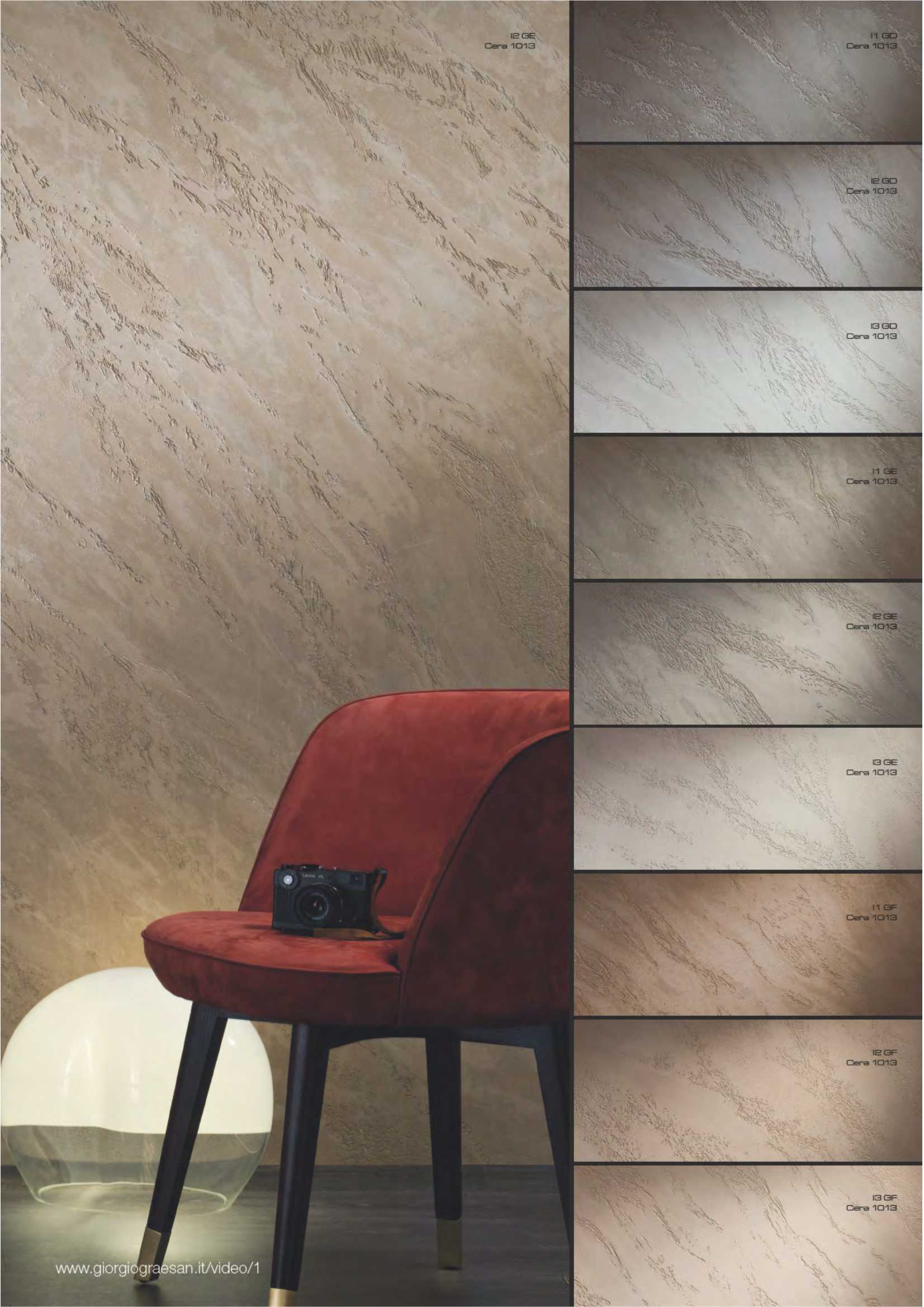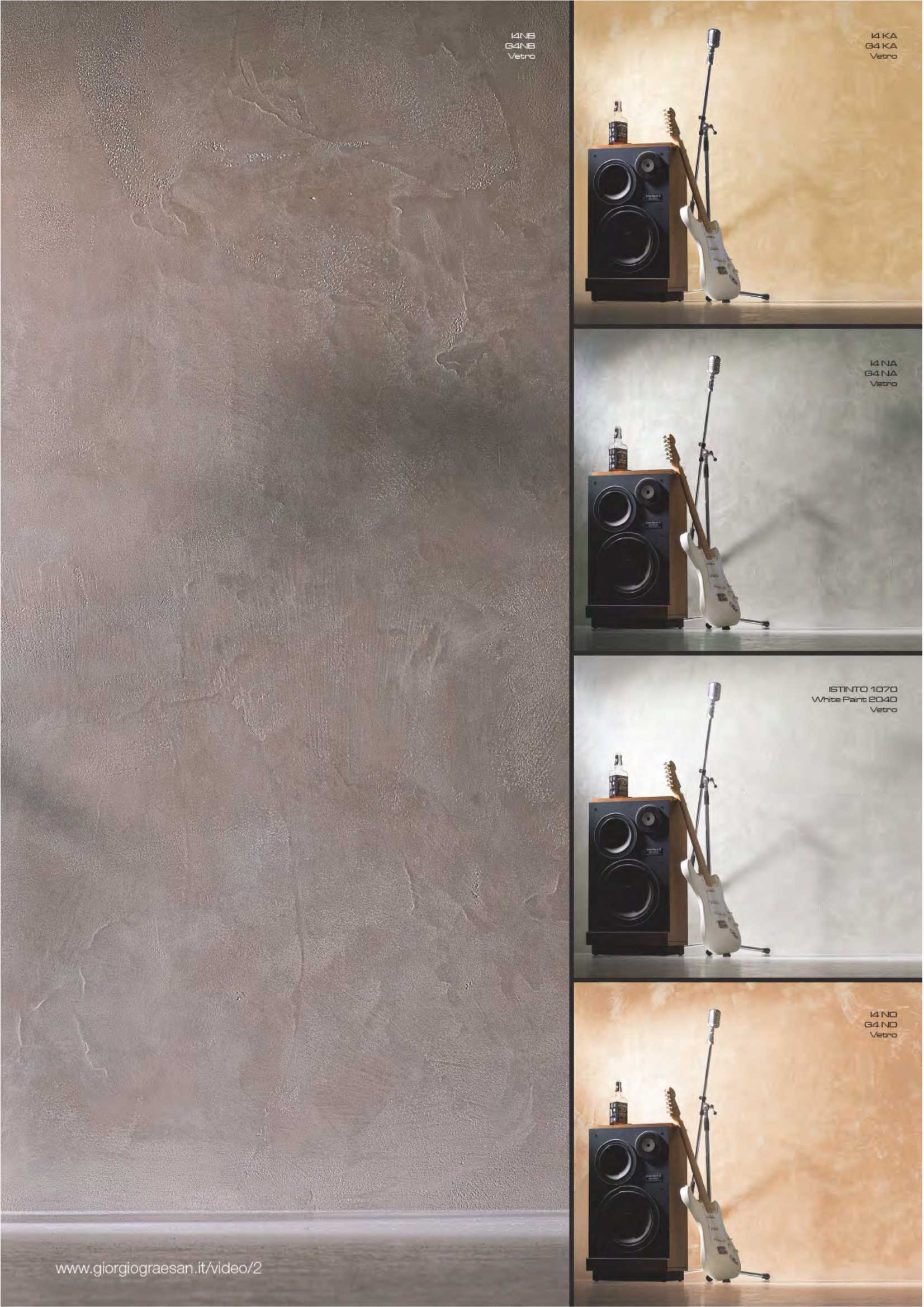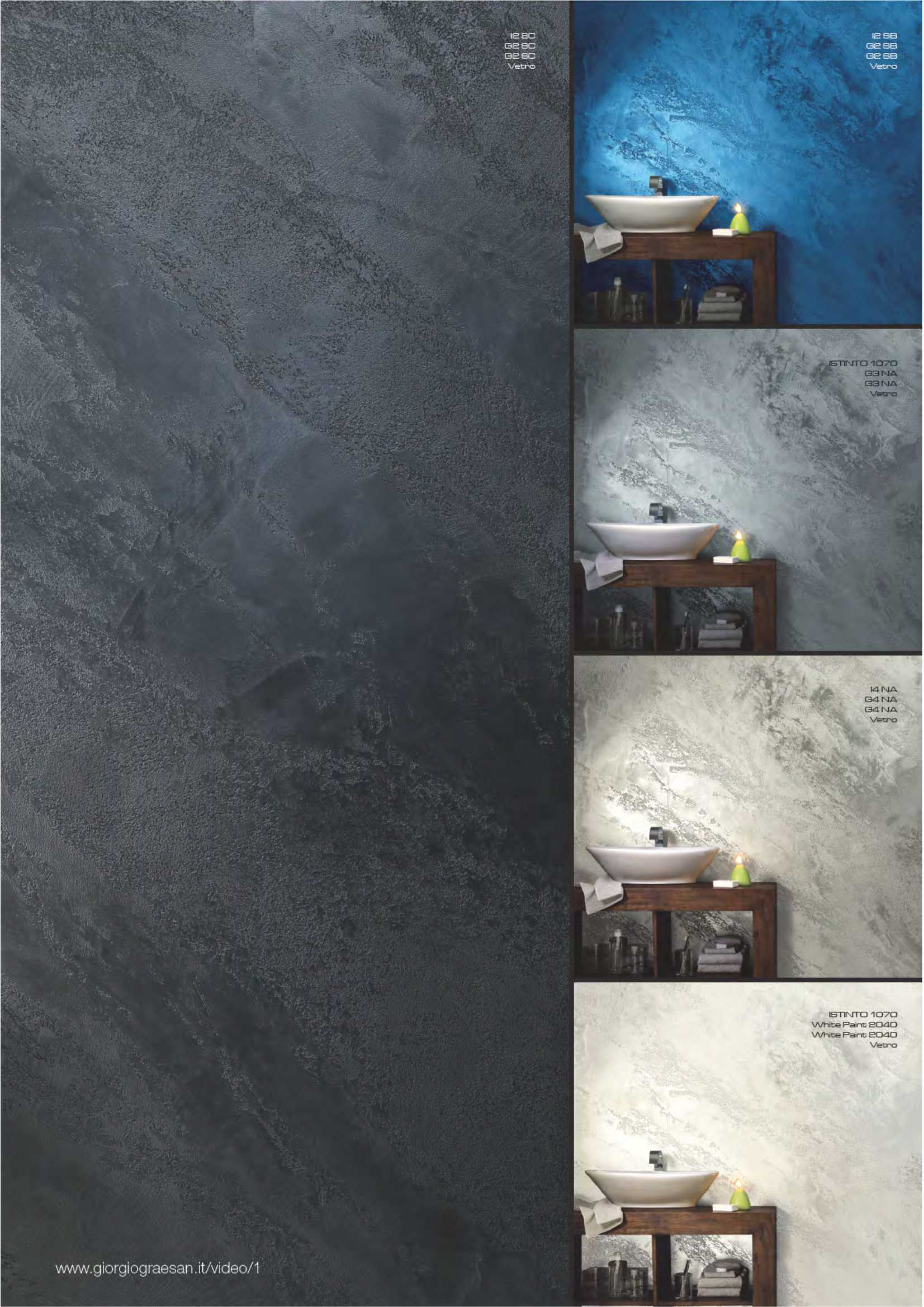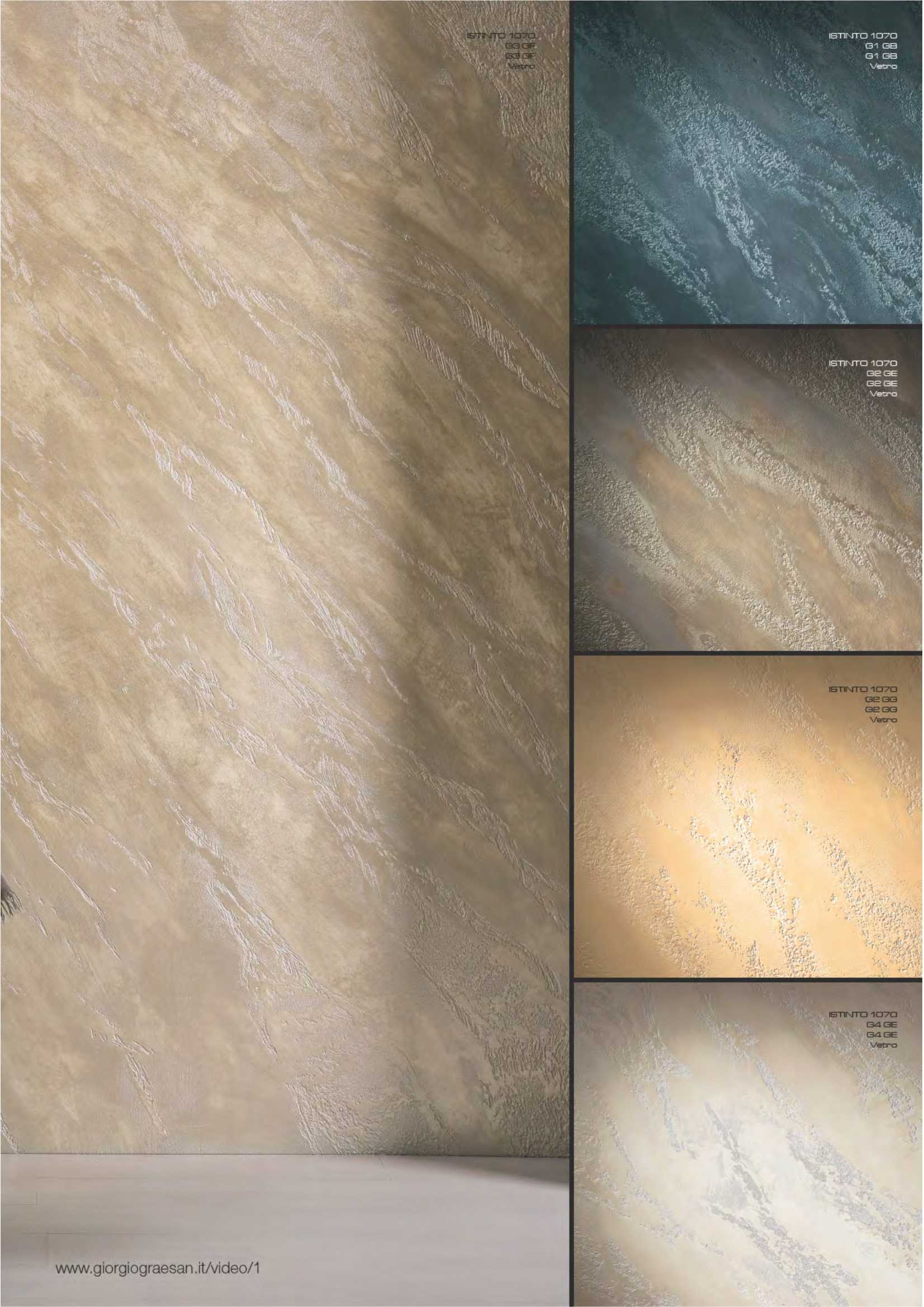 Renumit pentru Spatula Stuhhi sau Stucco Veneziano, cum îl cunoașteți mulți dintre dvs., brandul Giorgio Graesan este consacrat și pentru produsul de tip Instinto cu care se pot efectua următoarele modele: Pietra Spaccata, Zen, Bambus, etc. Ca producător de top, acesta mai are o gamă vastă de produse (culori și efecte) care pot satisface nevoile tuturor.